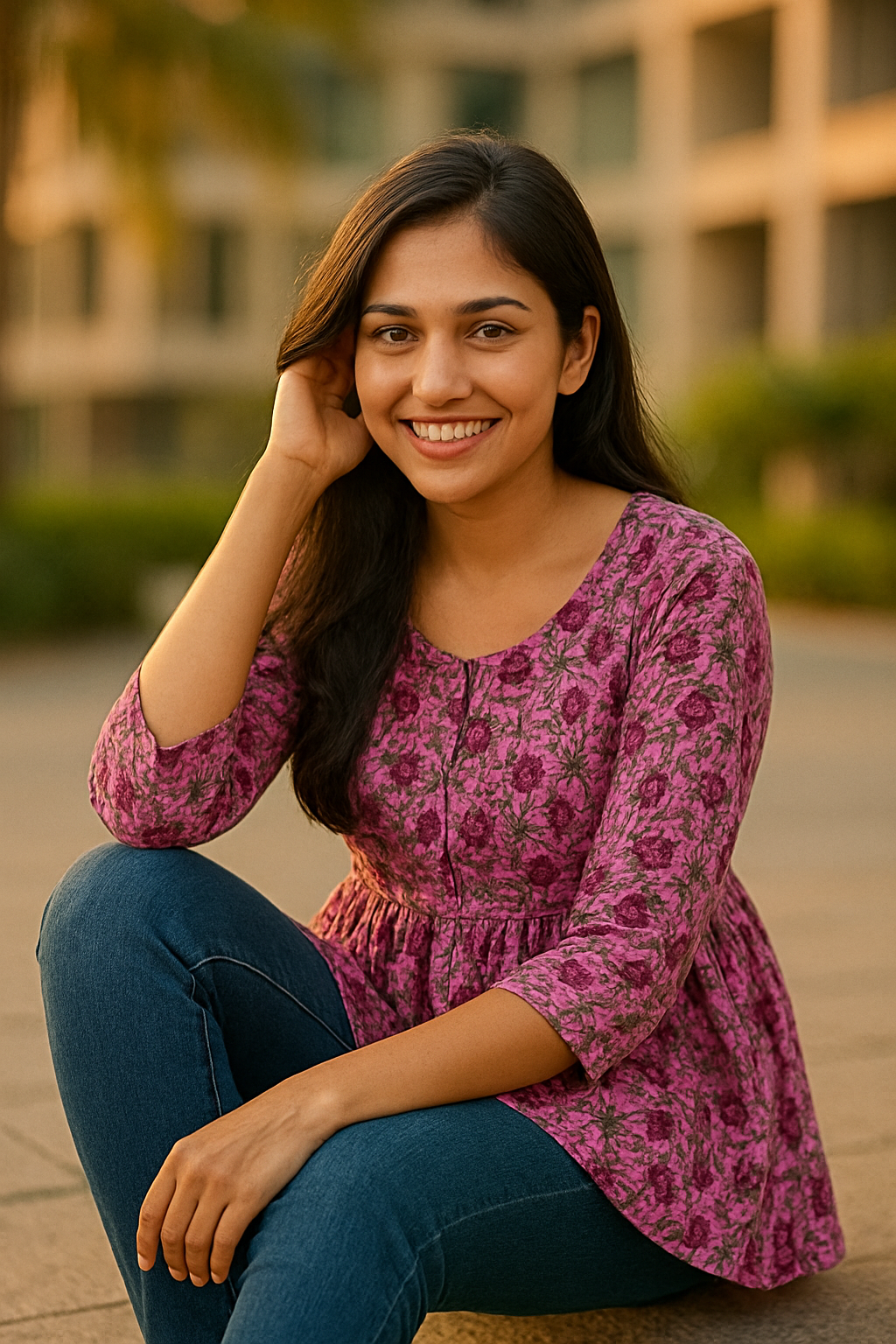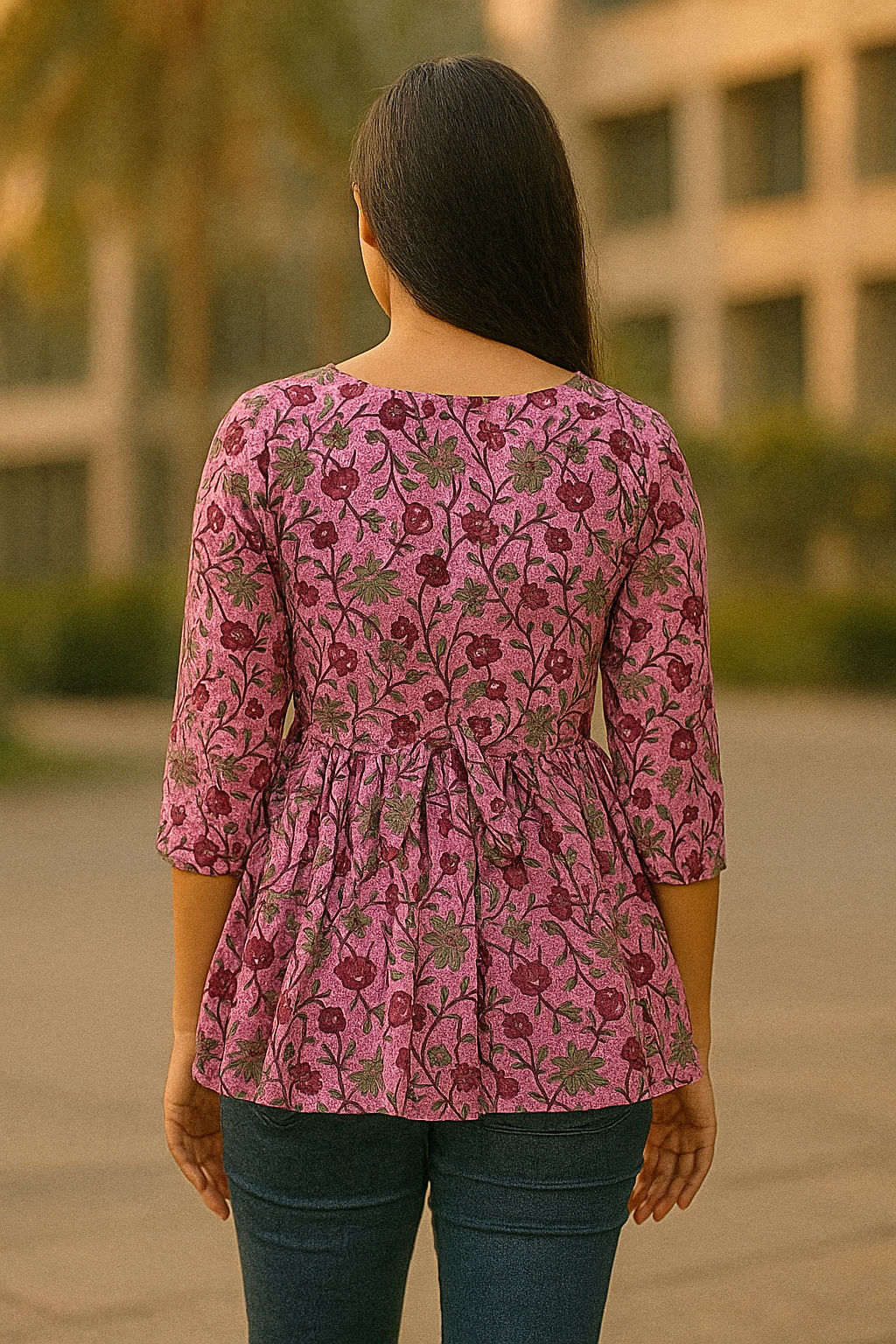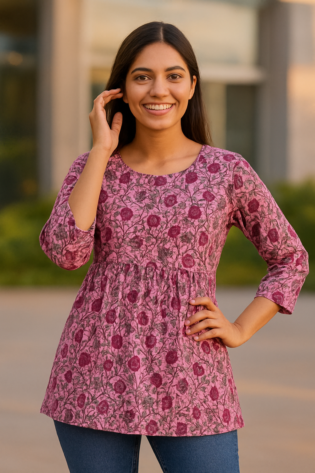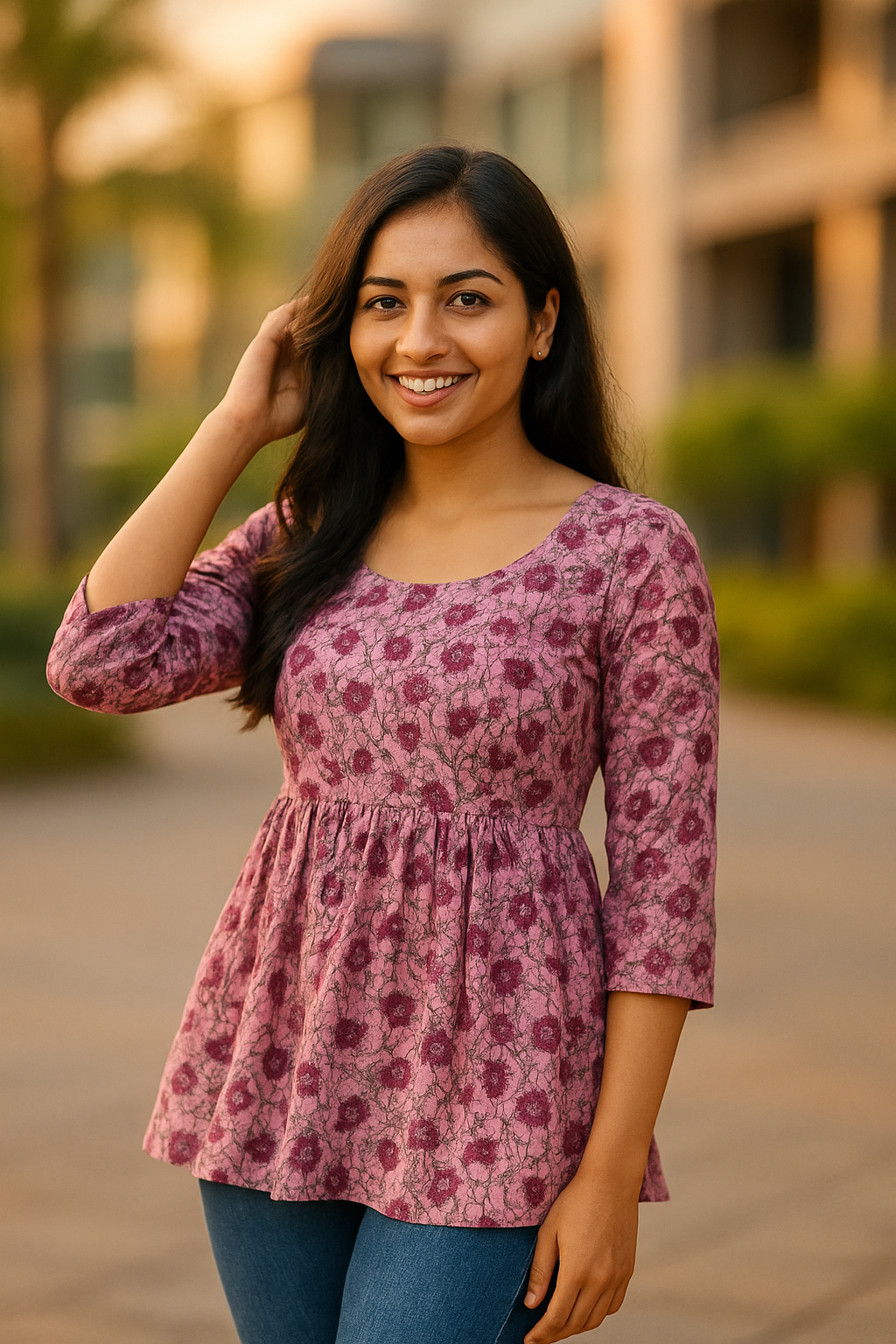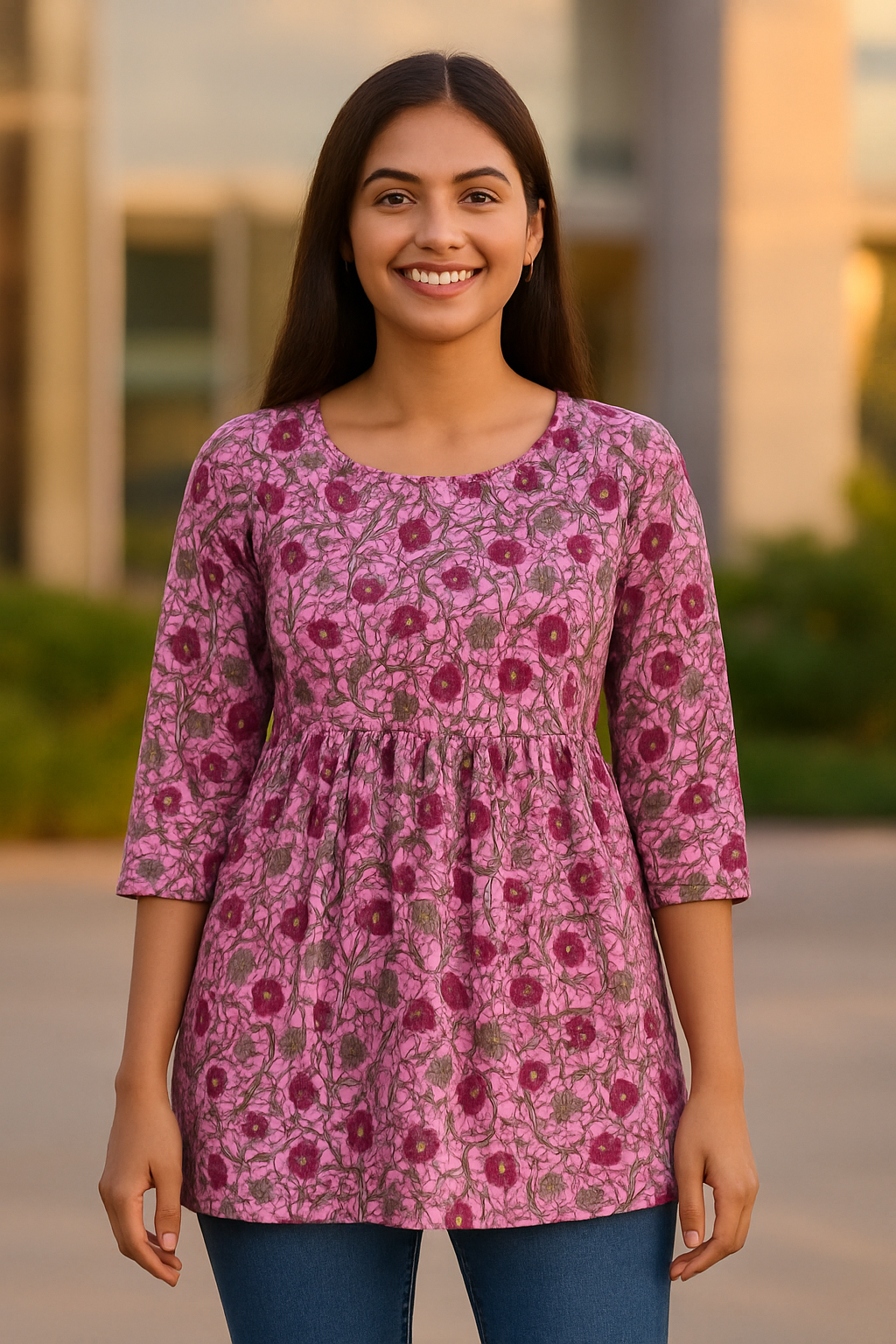 A royal purple cotton-blend kurti adorned with delicate floral motifs in golden-pink hues. Fabric: Soft, breathable cotton-blend, comfortable for all-day wear. Design: Classic straight fit with 3/4th sleeves and round neckline for an elegant silhouette. Look: The rich jamuni shade paired with subtle floral gul prints makes it perfect for festive gatherings, casual outings, or evening wear. Pair it with: Golden leggings, white palazzos, or denim for a versatile Indo-western look.