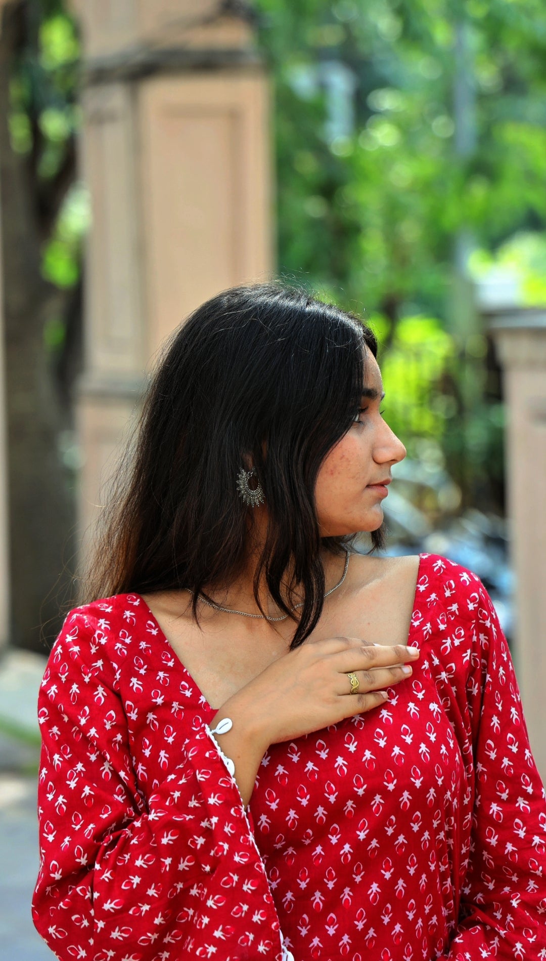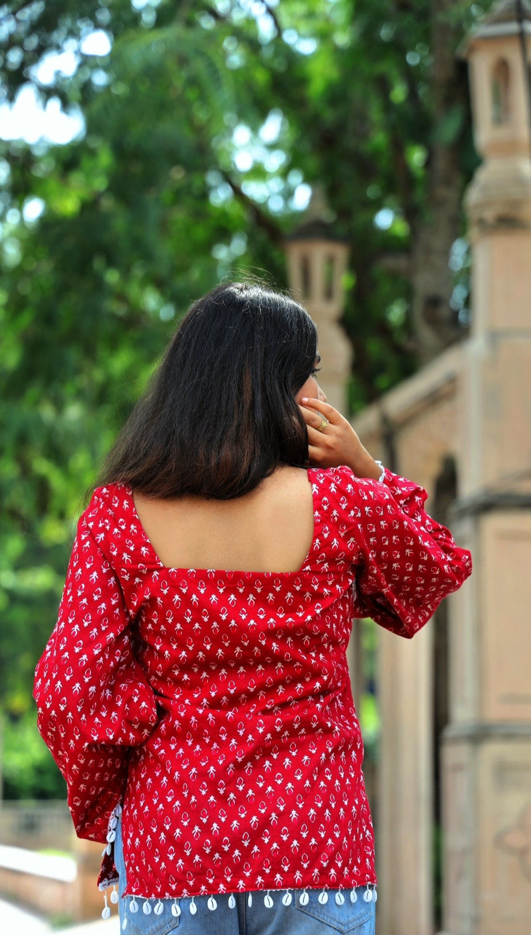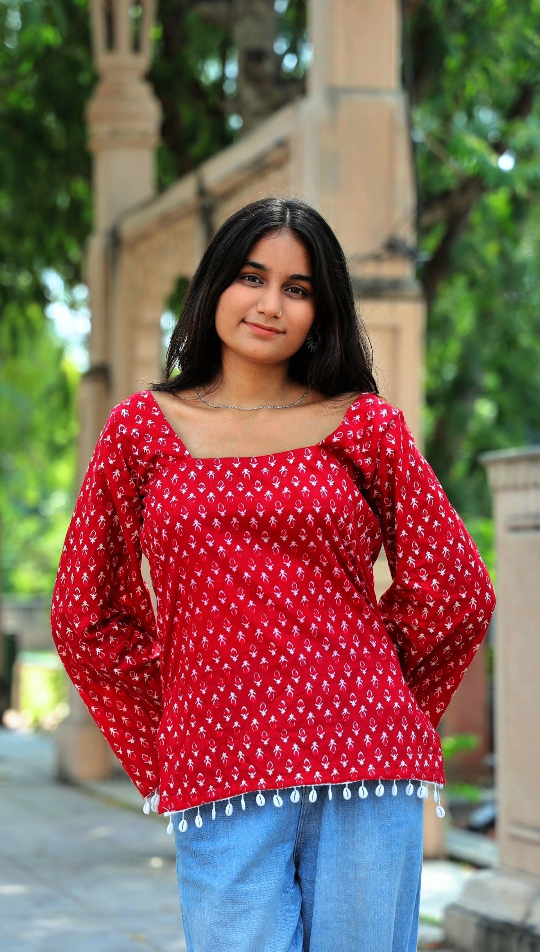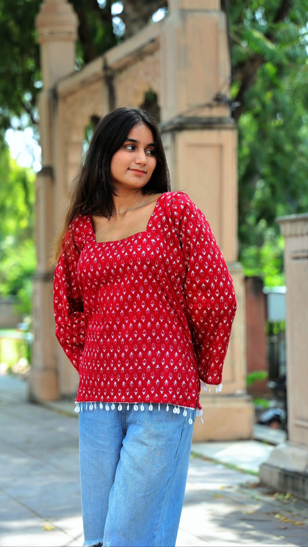 Wrapped in the warmth of crimson hues, this kurti embodies bold femininity with a hint of playful grace. The soft cotton fabric drapes beautifully, while the delicate white hand-block motifs tell tales of timeless elegance.
