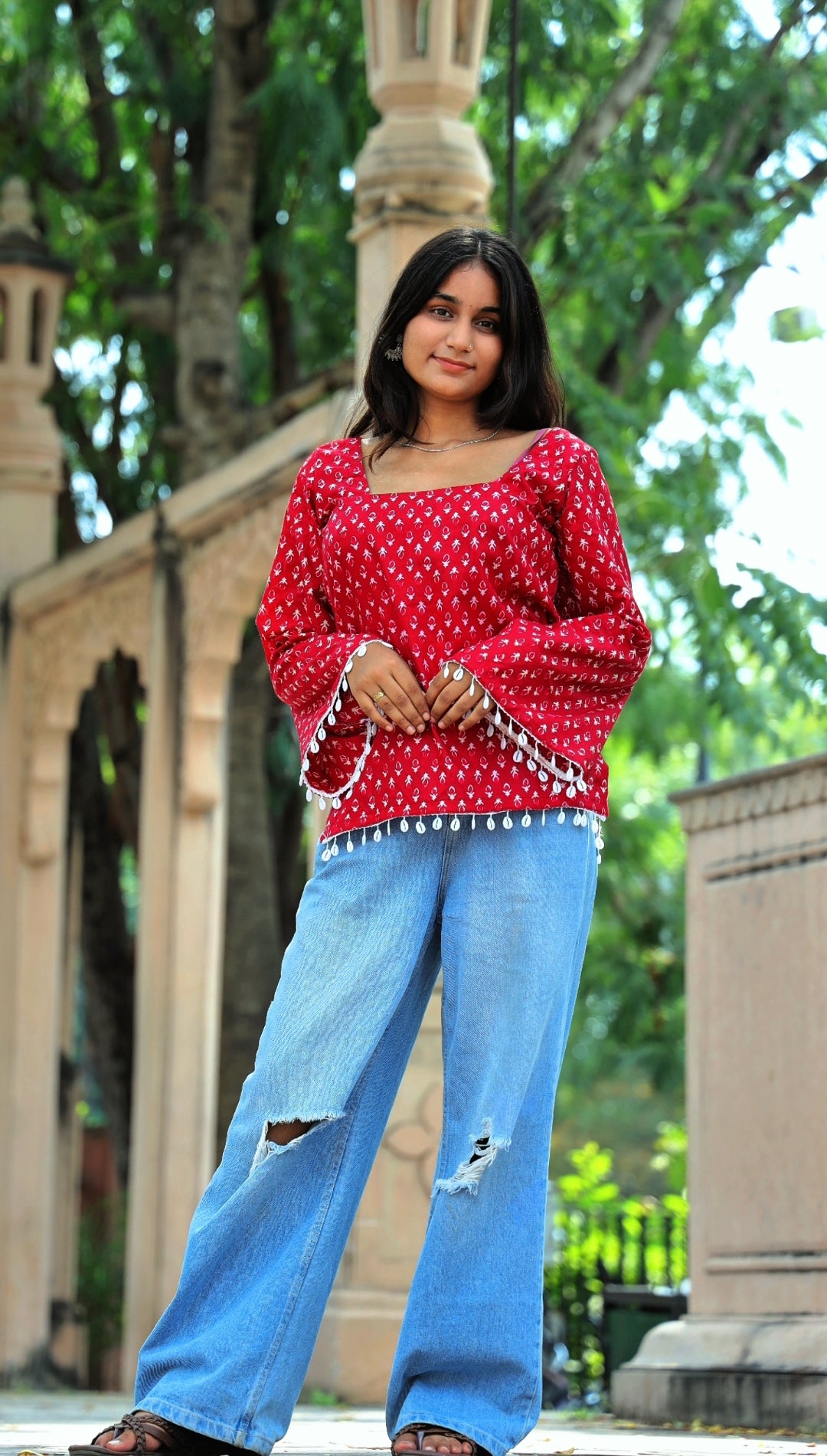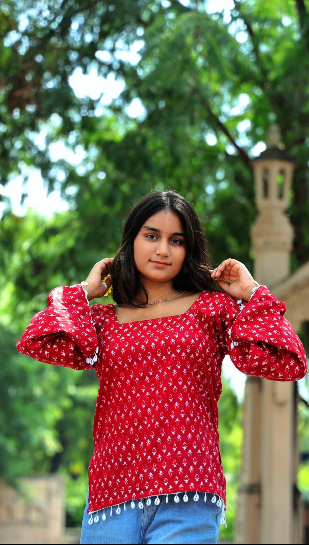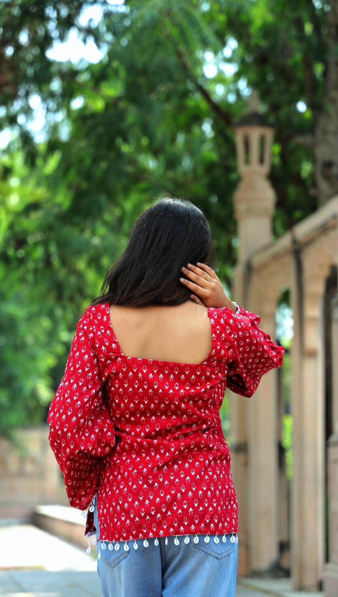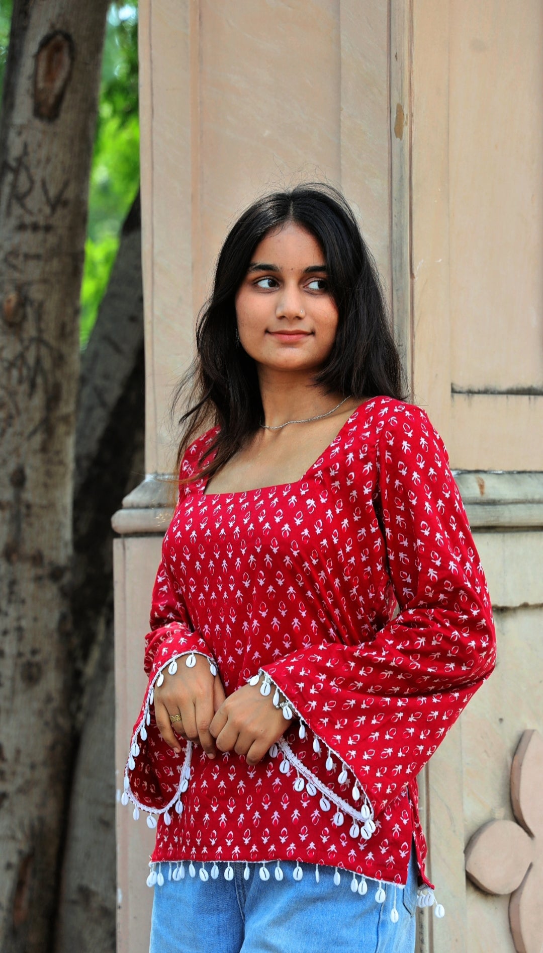 Wrapped in the warmth of crimson hues, this kurti embodies bold femininity with a hint of playful grace. The soft cotton fabric drapes beautifully, while the delicate white hand-block motifs tell tales of timeless elegance.