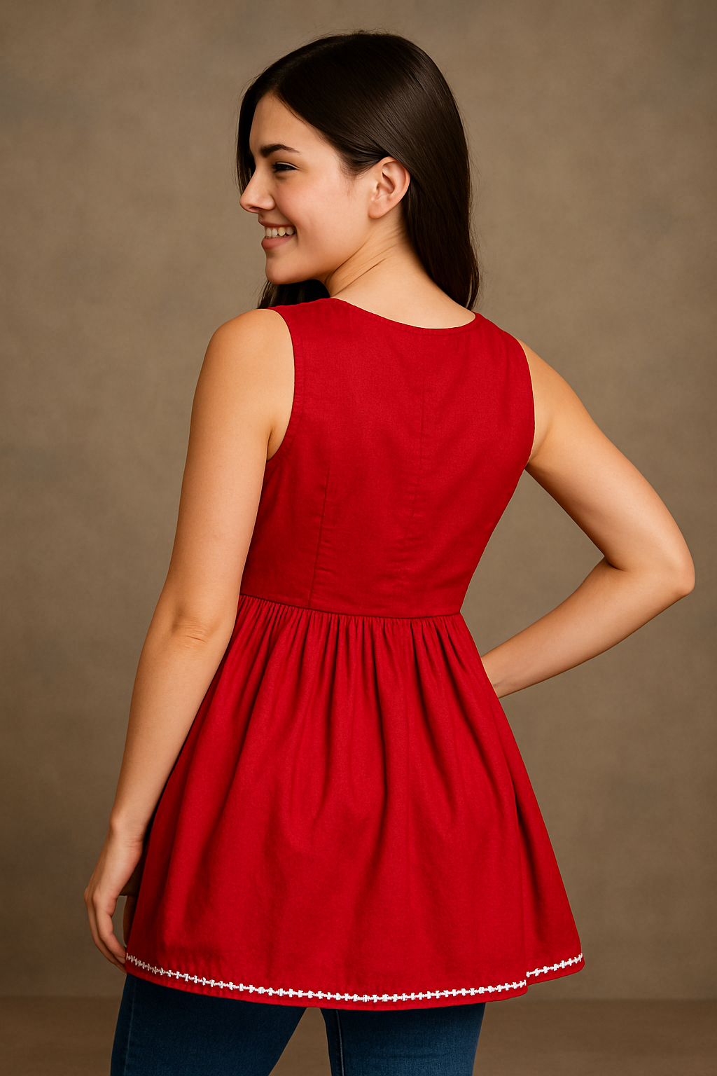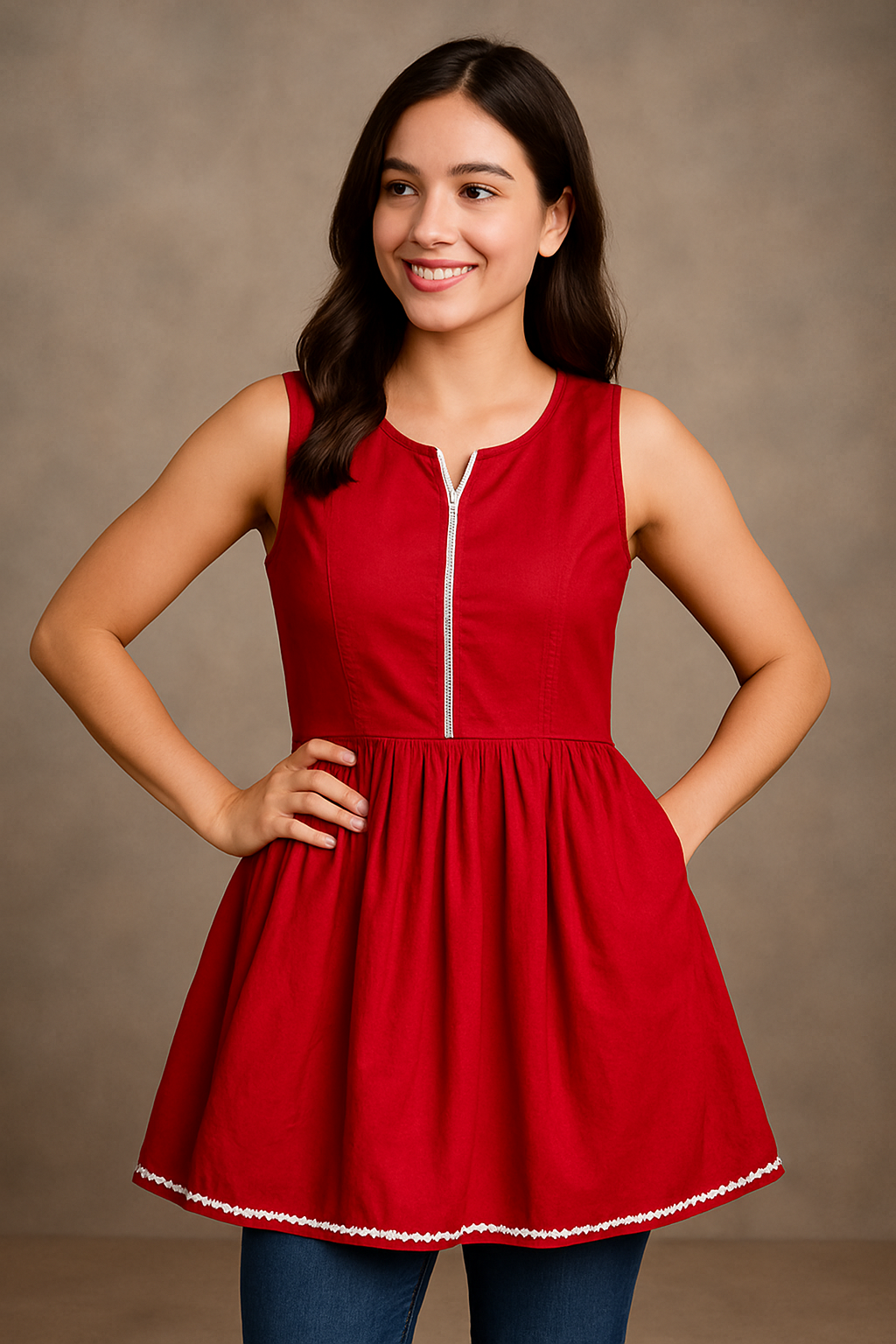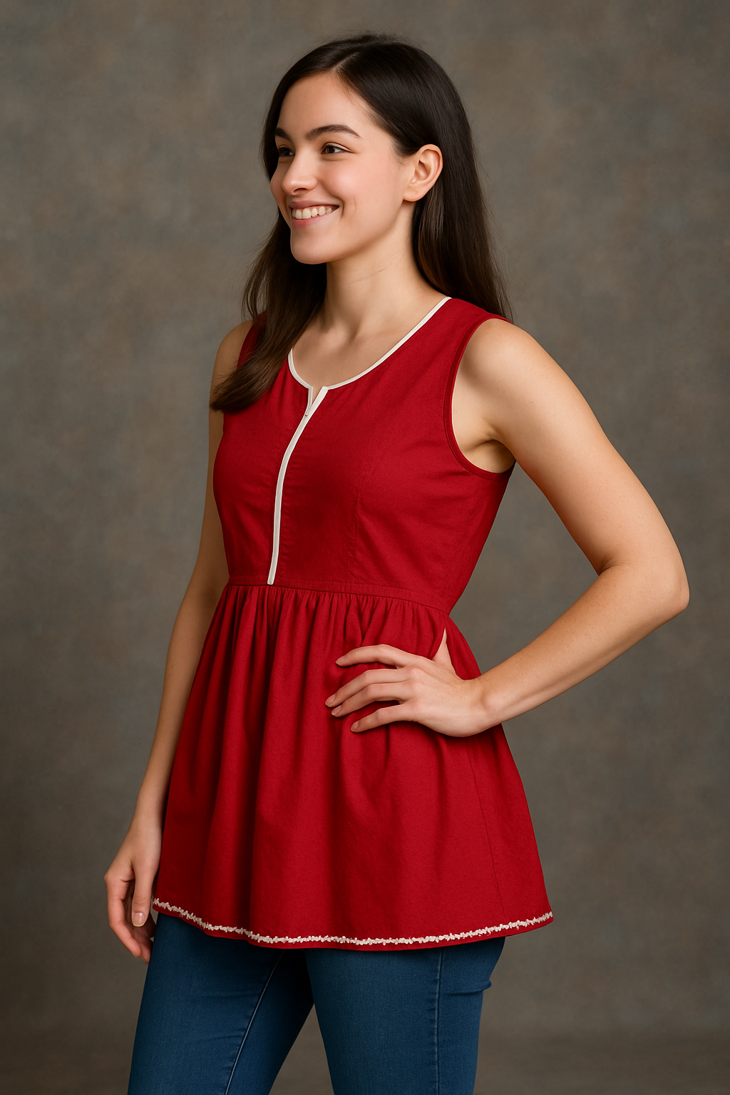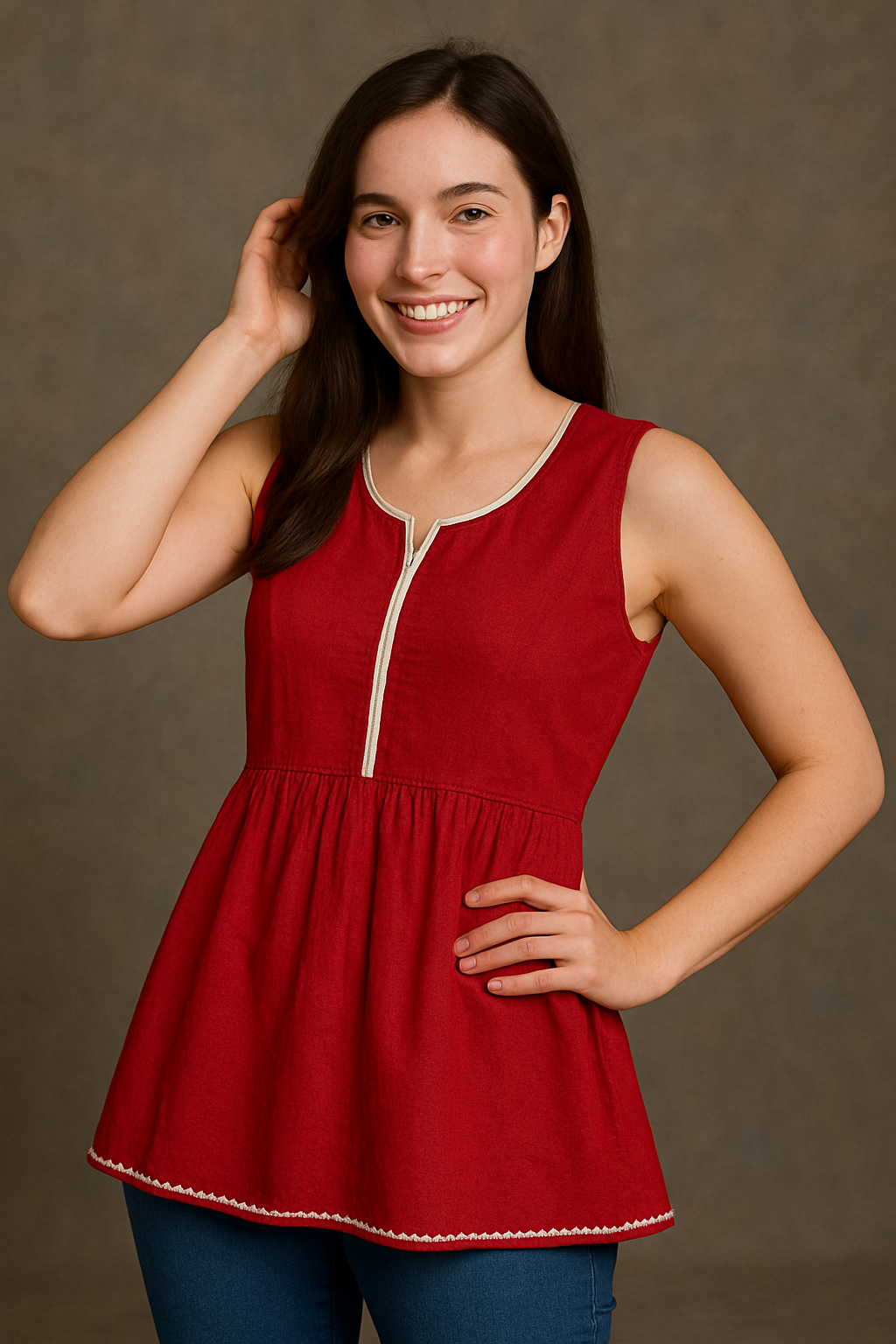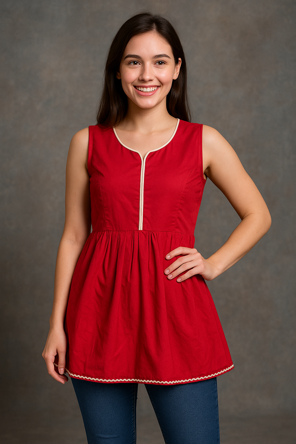 A vibrant red cotton kurti highlighted with elegant golden braiding — striking yet minimal. Perfect for festive moments or making a bold ethnic impression.