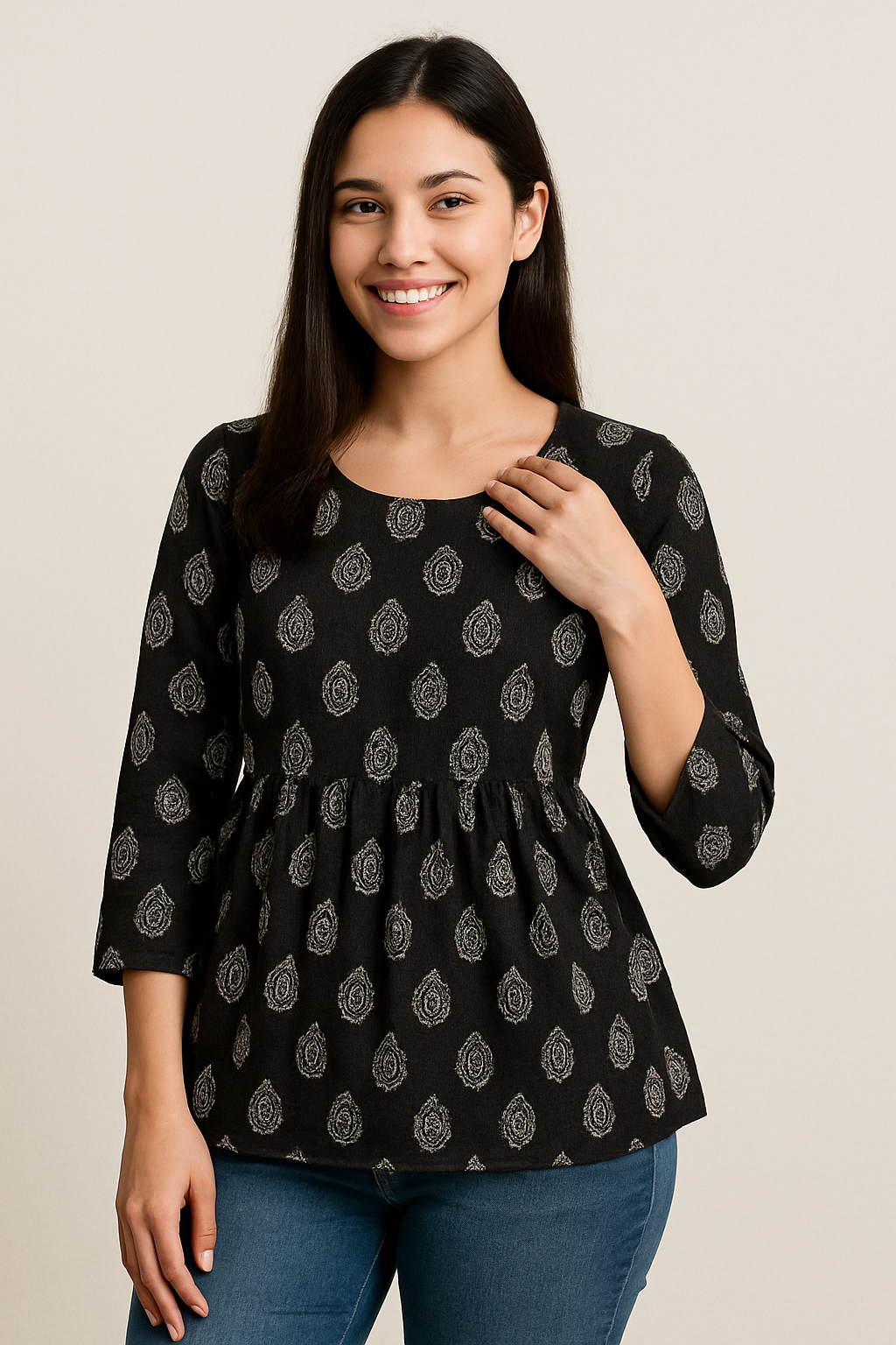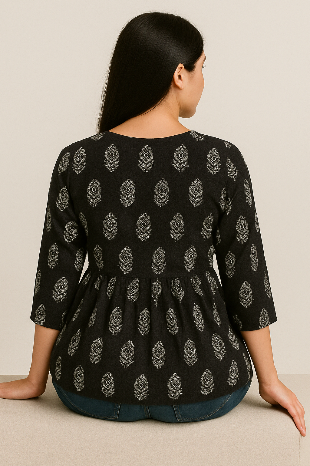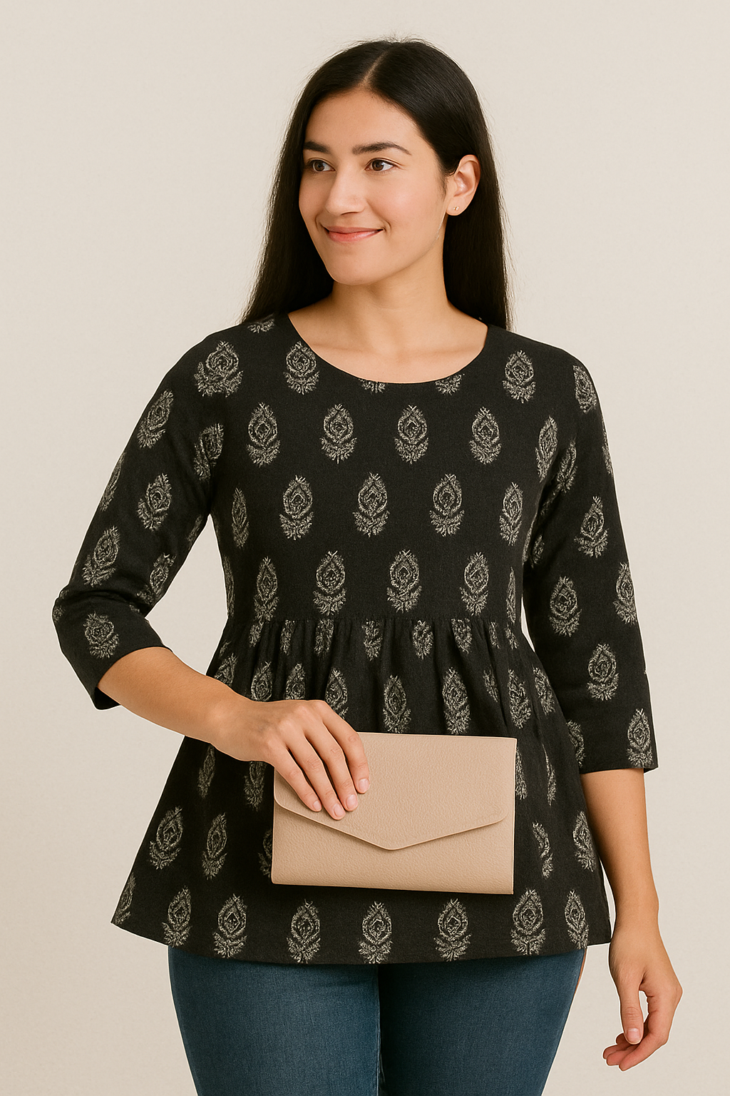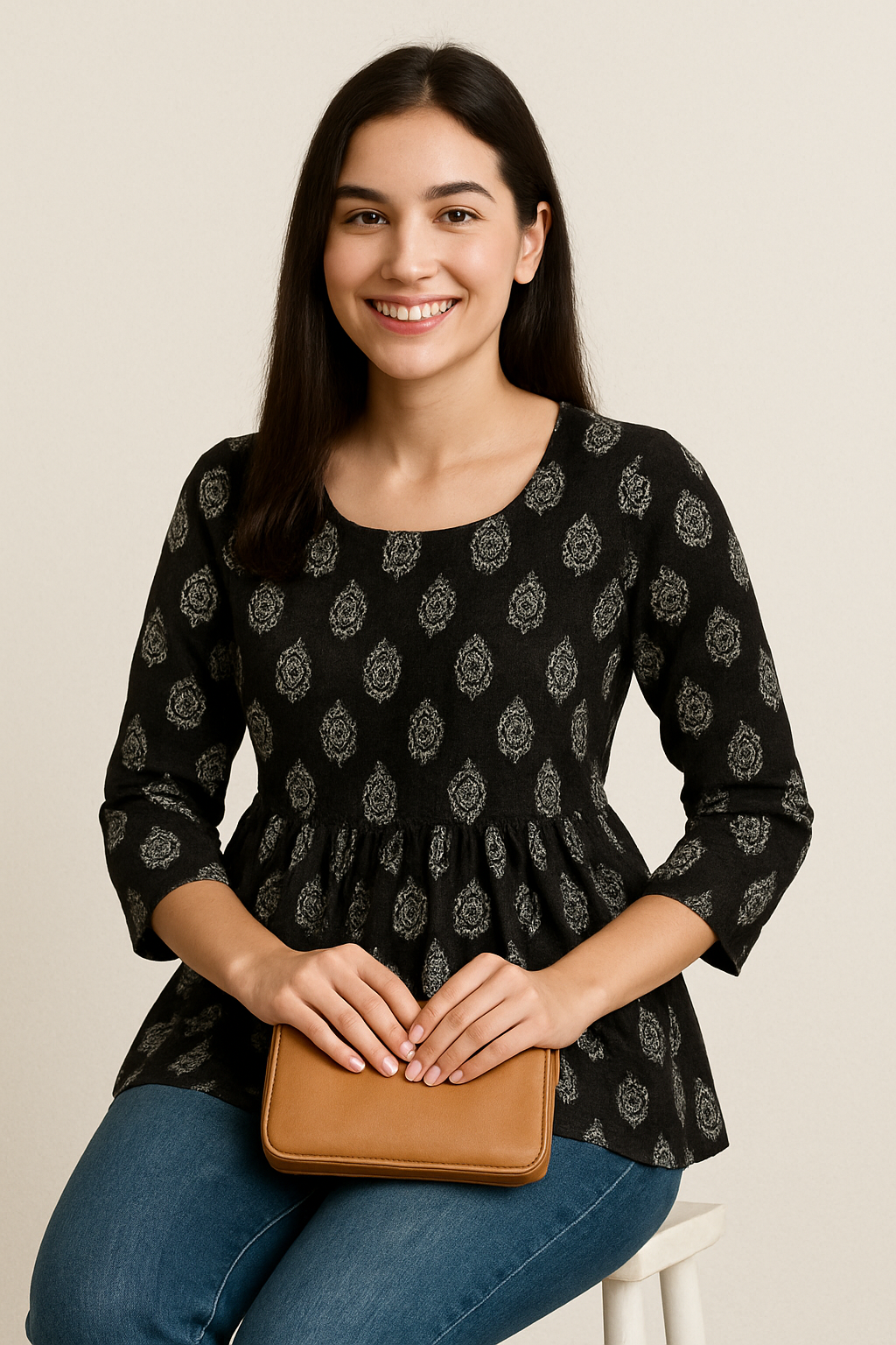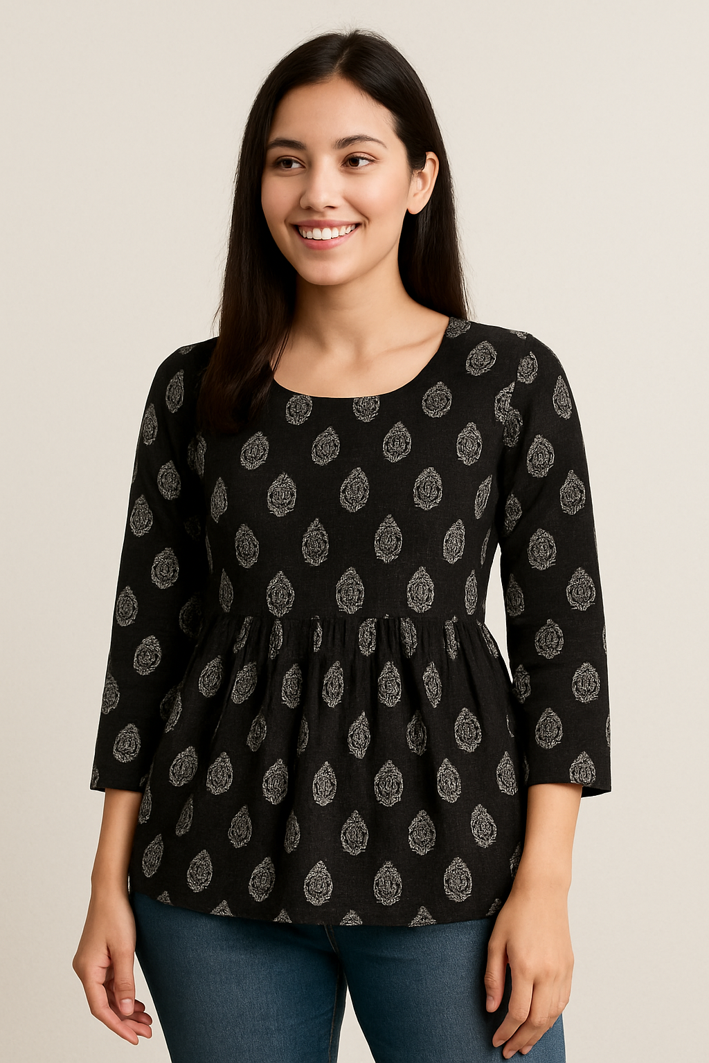 Step into elegance with our Midnight Mogra kurti – a stunning blend of deep black cotton and hand-blocked white mogra prints.